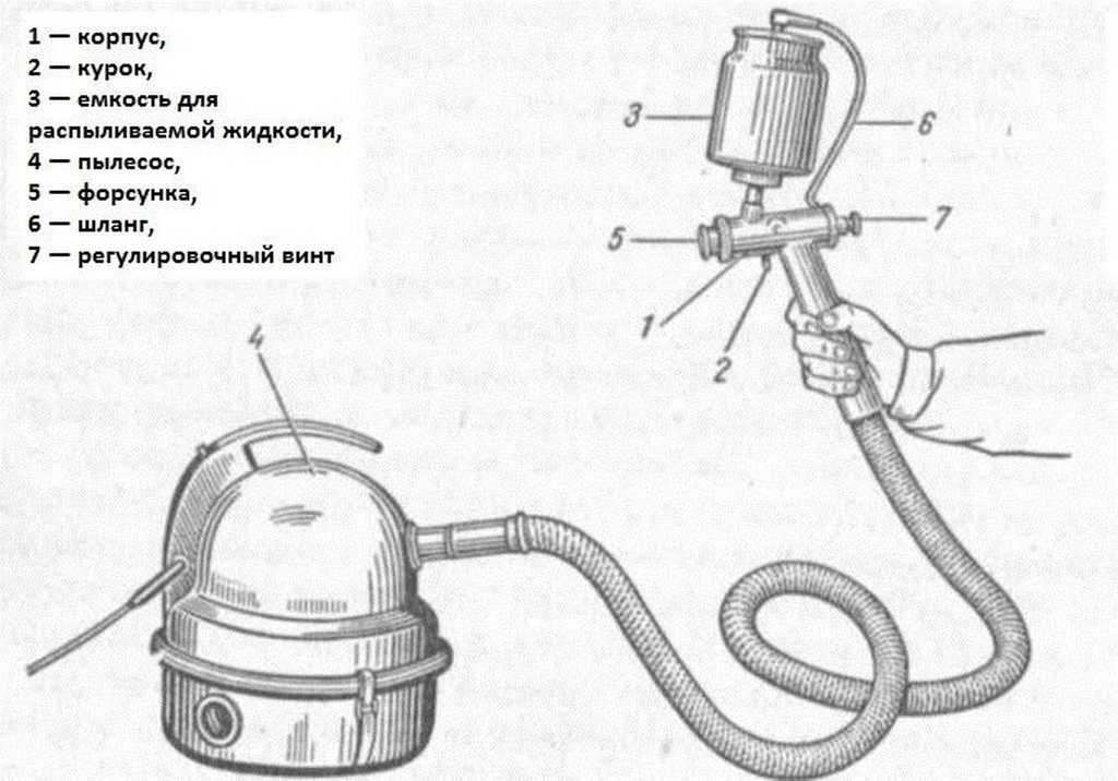 Зная устройство и принцип действия краскопульта, можно собрать прибор самостоятельно. В качестве компрессора в этом случае актуальным будет обычный пылесос мощностью 1500 Вт.