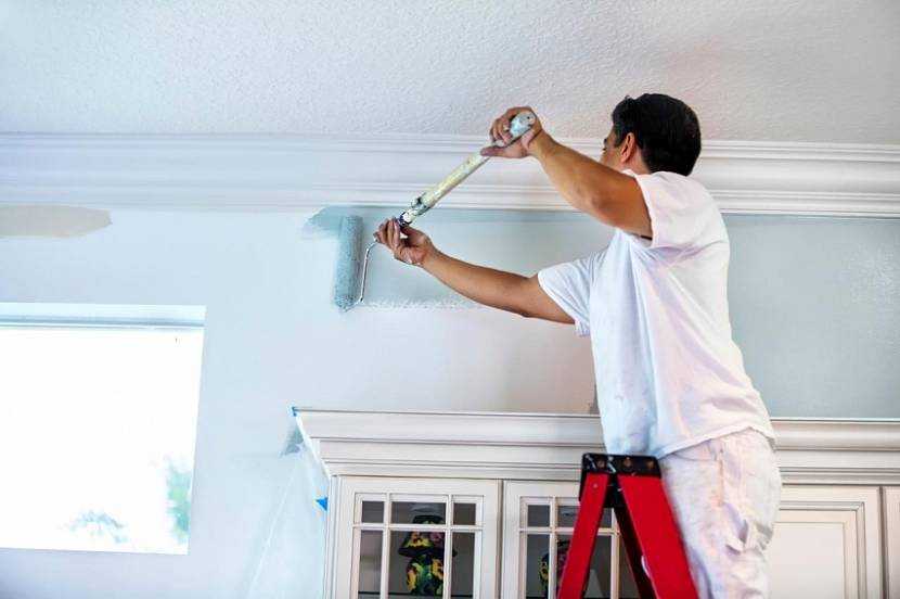 Потолок и высокие стены красят валиком, надетым на длинную штангу.