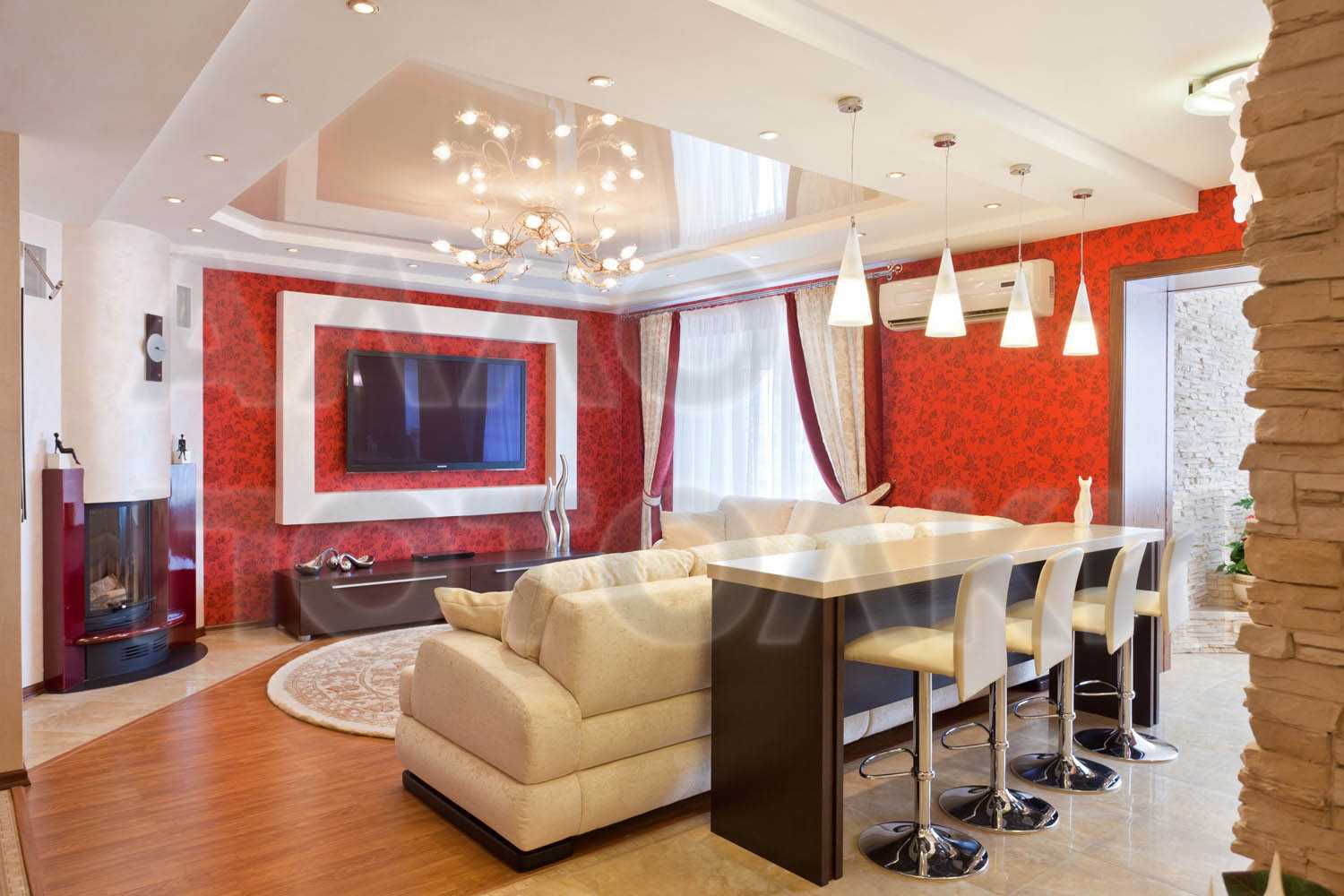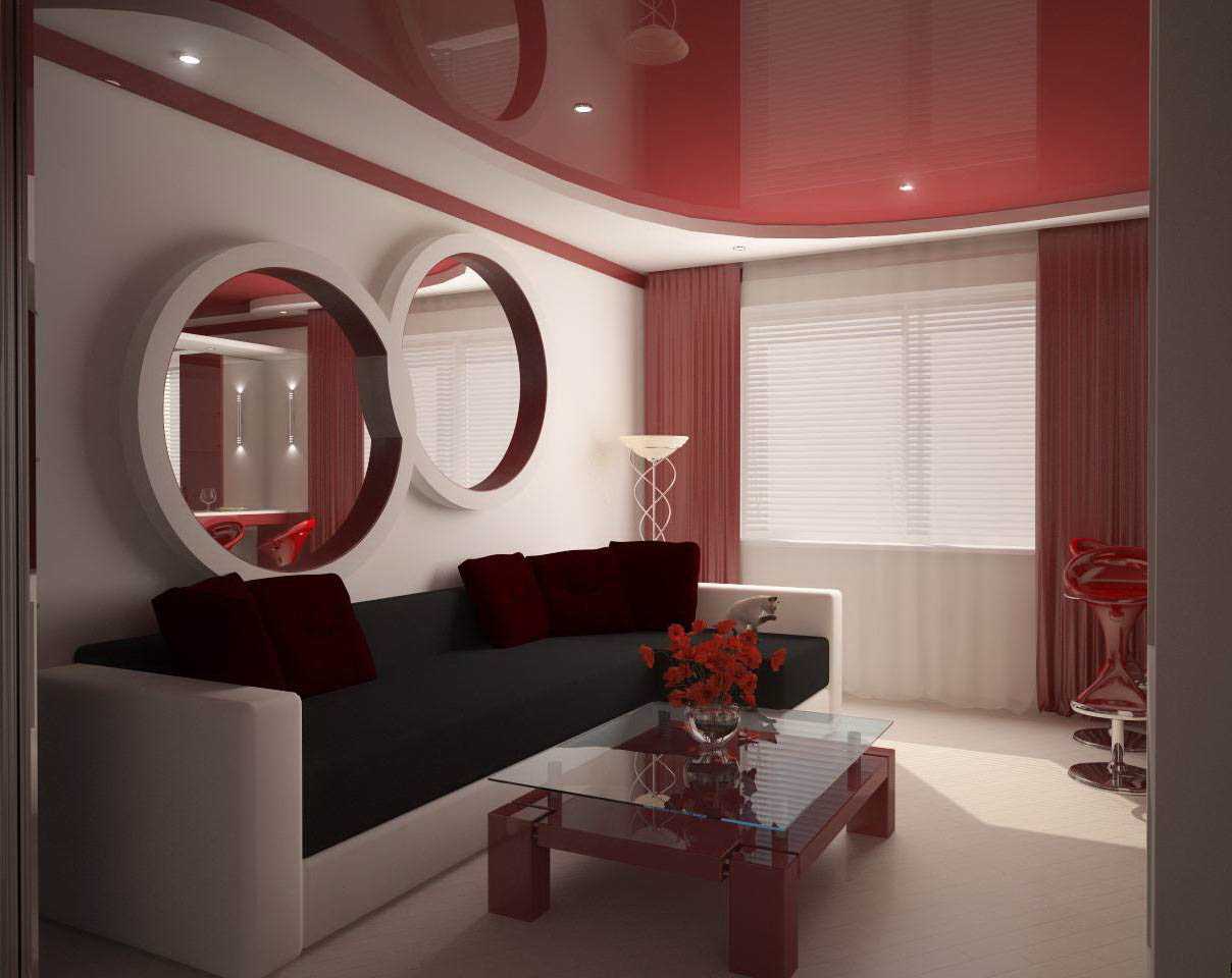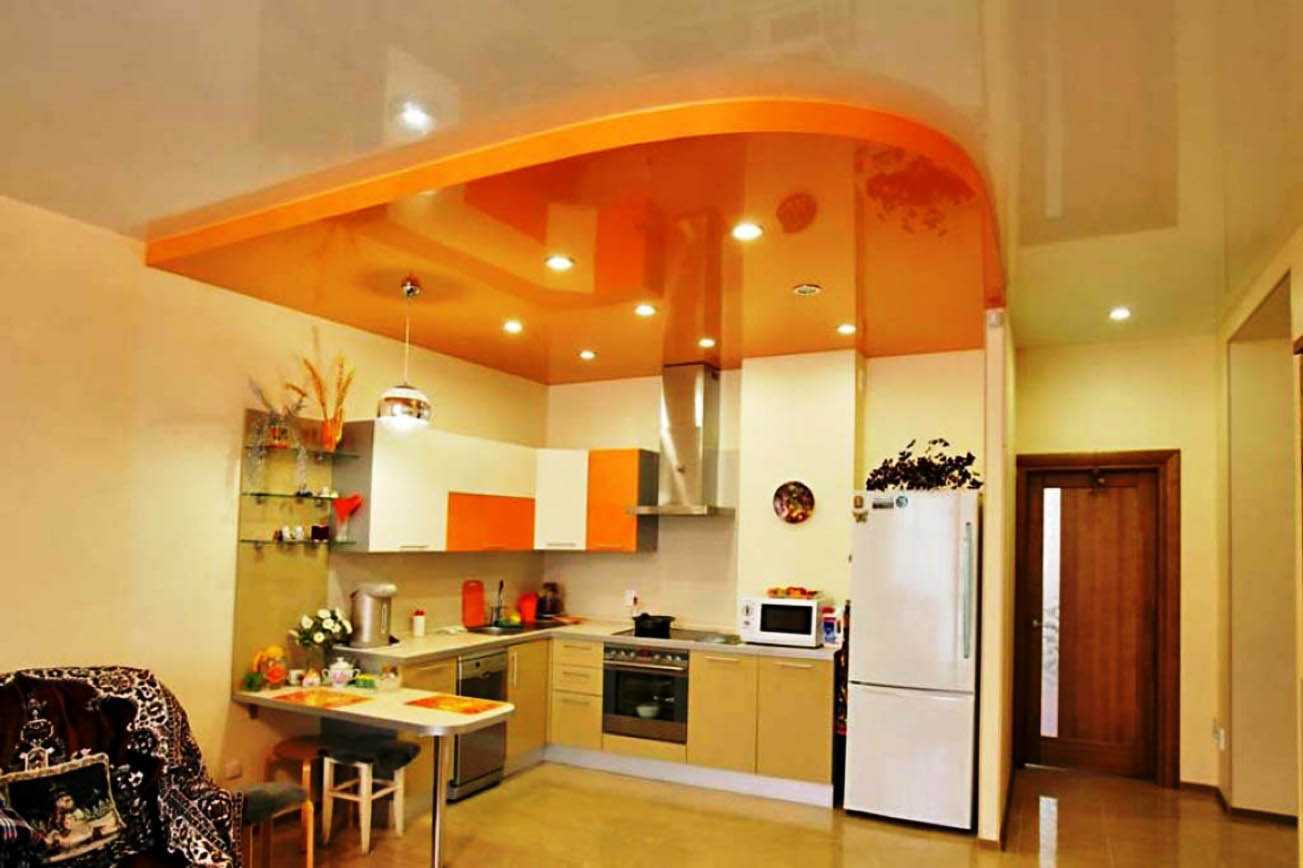 Часто в малогабаритных квартирах кухню совмещают с гостиной – подобный вариант дизайна выглядит современно и оригинально. Чтобы помещение гармонично сочетало в себе место для отдыха и приёма пищи, дизайнеры рекомендуют делить пространство на зоны с помощью двухъярусных натяжных потолков. Для этого в конструкциях нужно применить установку различных геометрических деталей и выполнить разграничение с помощью прямых линий.