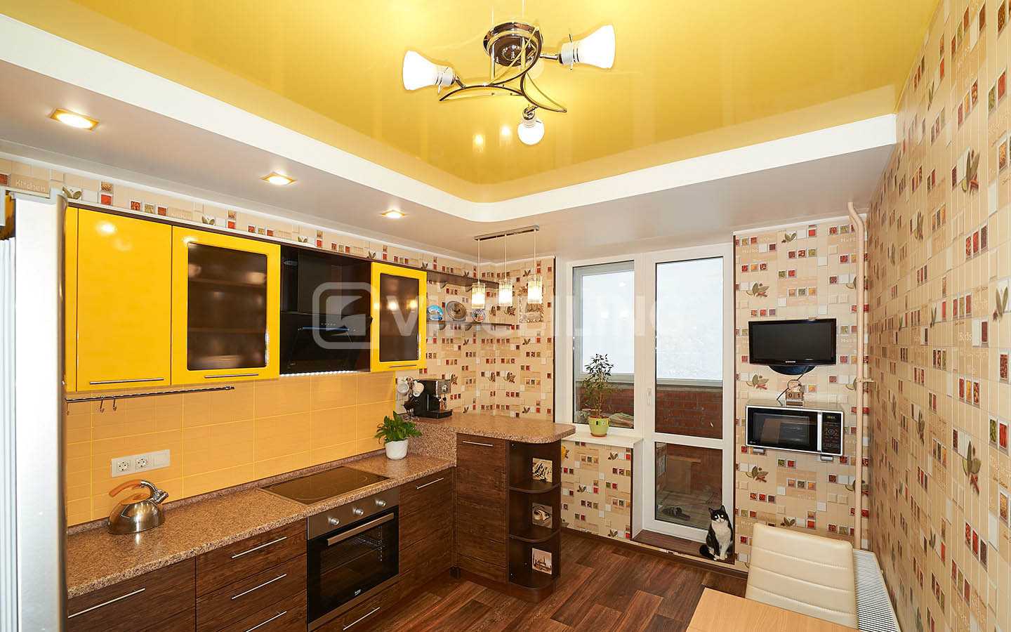 Натяжной потолок на кухне с необычным расположением точечных светильниковИсточник natyazhnoy-potolok.su
