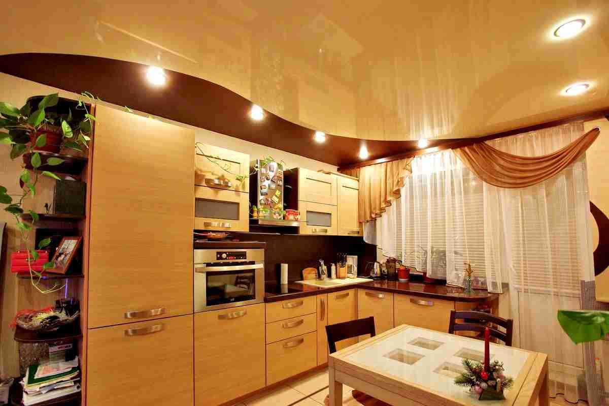 Чтобы кухня-гостиная имела праздничный вид, её лучше всего украсить двухъярусными композициями белого цвета, а в качестве освещения установить стеклянную люстру и точечные светильники. Для форм потолка подойдут круглые и овальные вставки. Неплохим вариантом также станет монтаж потолка, сочетающего в себе белый и светло-бежевый цвет. В этом случае два яруса накладываются по периметру комнаты, образовывая объёмный квадрат. По краям конструкции устанавливают лампы, яркость которых можно регулировать.