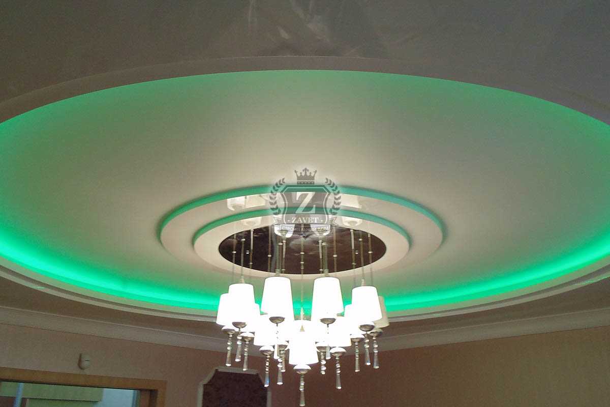 Подиум под люстру. Название говорит само за себя. Если осветительный прибор имеет крупные габариты, можно отделить для него центральную часть на потолке при помощи многоуровневого потолка.