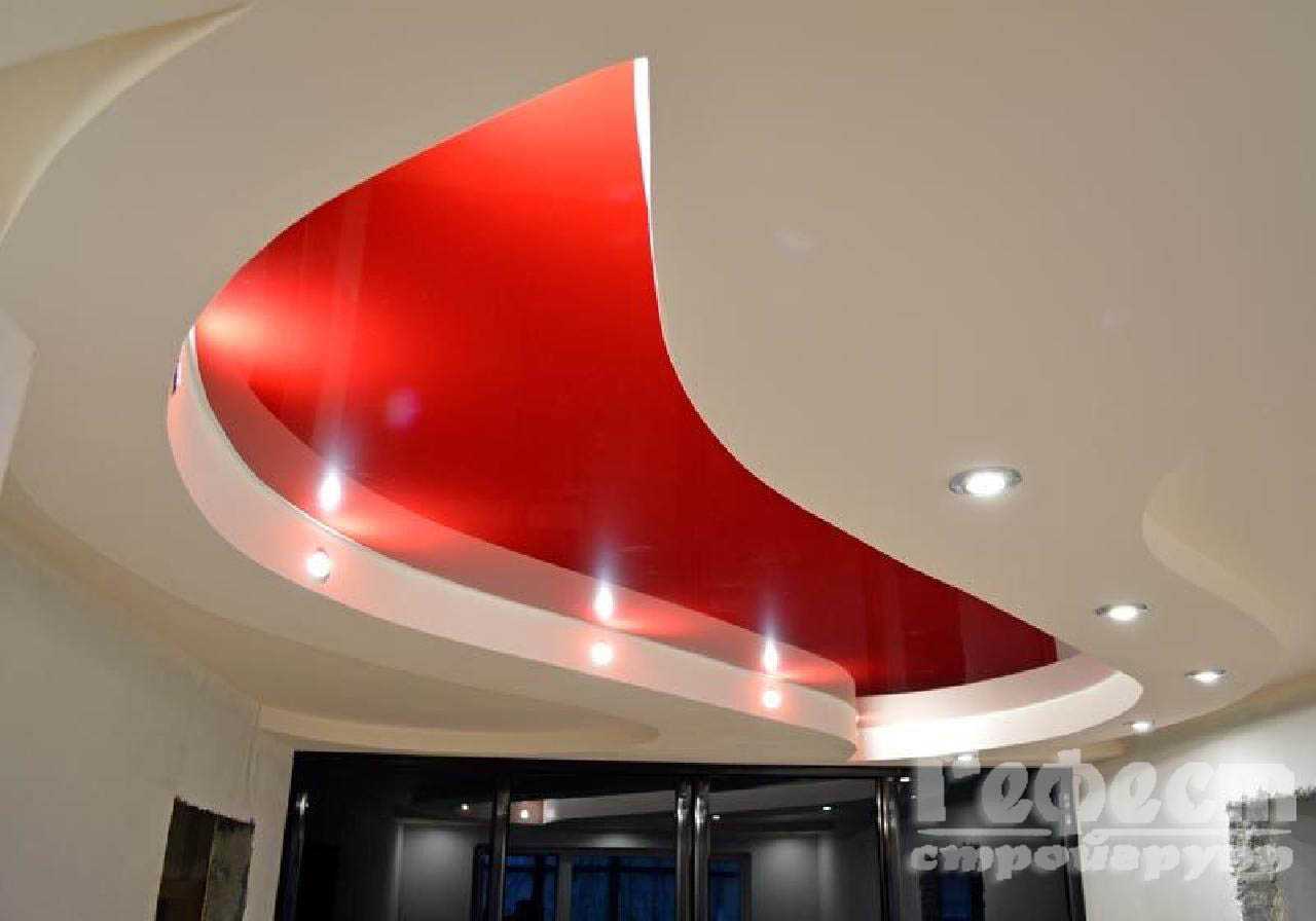 Такие конструкции различаются между собой количеством уровней, дизайном и сложностью технологических работ. Например, можно установить систему из двух ярусов, сделав из натяжного полотна основу потолочной поверхности. Также монтируют трехуровневые потолки, включающие сложные криволинейные элементы, множество оттенков.