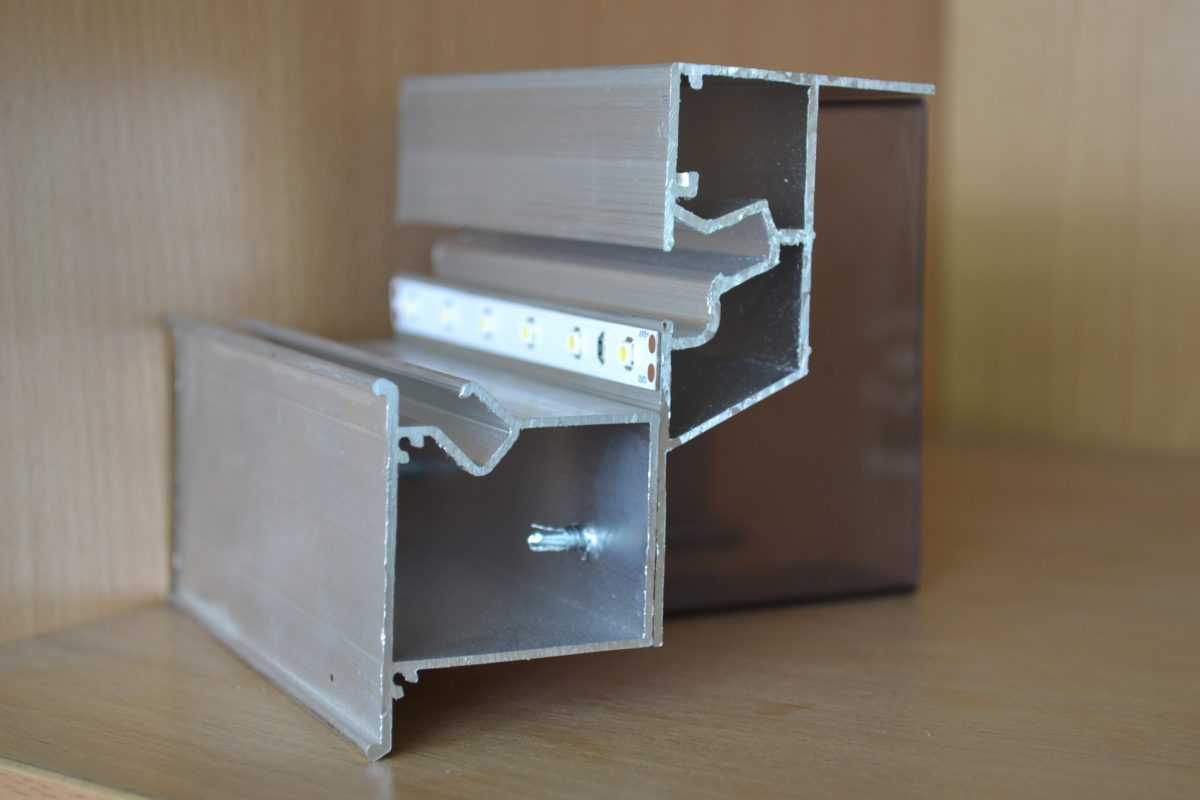 Принцип обустройства многоуровневого потолка состоит в создании каркаса, основы из багетов, куда и заправляют само полотно. Изготавливают багеты либо из алюминия, либо из пластика. Существует несколько разновидностей профилей для монтажа. Они бывают универсального назначения, используются для установки любых форм системы, стенового плана, где фиксация производится непосредственно к стене, и потолочный вариант, применяемый для крепления к потолку.