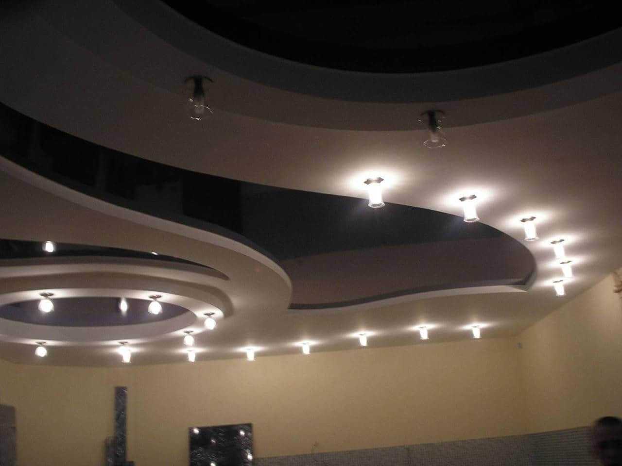 Оригинальный вид имеют многоуровневые потолки со ступенчатым расположением ярусов и светильников. Уровни чаще всего организуют в форме кругов, расположенных на определенном расстоянии друг от друга. Но не менее эффектны конструкции, представляющие собой многоуровневую вложенность различных геометрических фигур.