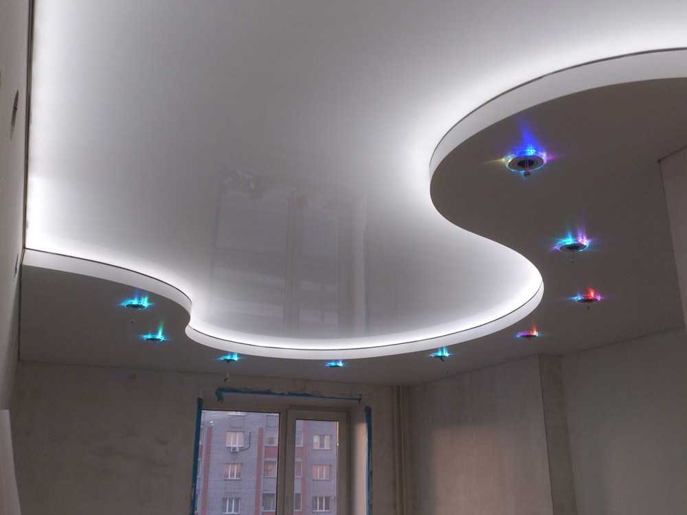 Главное — не переборщите с интенсивностью освещения и оттенками на многоуровневом полотне. Пестрые, кричащие тона приберегите для других помещений. Например, детской.