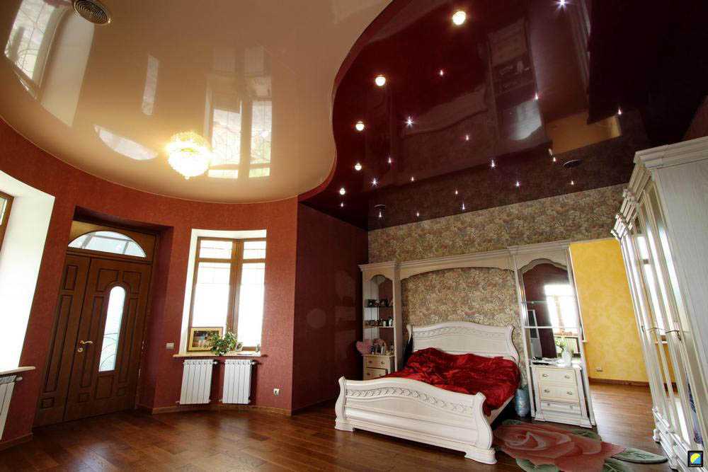 По-особенному в маленьких спальнях смотрятся потолки с глянцевой поверхностью, но если яркий свет будет мешать отдыху, то можно установить и матовые полотна. Нежелательно в таких комнатах устанавливать композиции сложных форм, так как детали неправильных фактур «украдут» площадь пространства. Для просторных спален можно выбрать бежевую гамму, так как она оригинально выглядит на глянцевой поверхности. Центр потолка лучше всего выделить тёмным оттенком, продолжением которого послужит мебель и другие предметы декора.