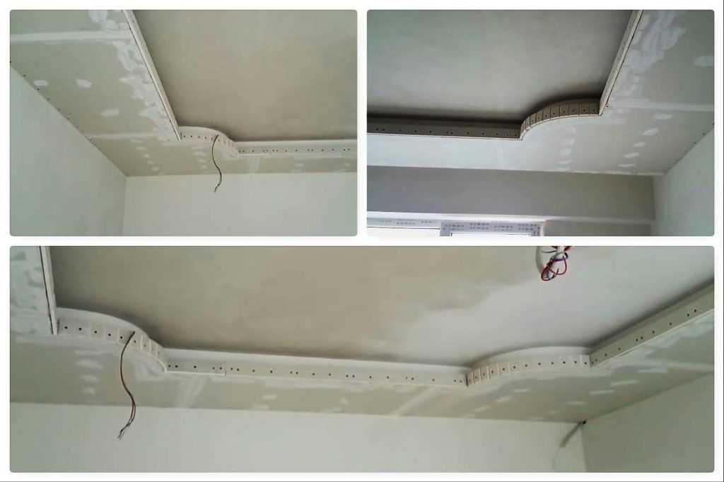 Достаточно наклеить на определённой высоте от профиля. Когда подсветка закреплена, нужно начать монтаж внешнего бортика. Он необходим, чтобы скрывать всю конструкцию короба. На закруглённых участках, чтобы добиться заданной формы от гипсокартона, необходимо каждые 5 см его ровно надламывать.