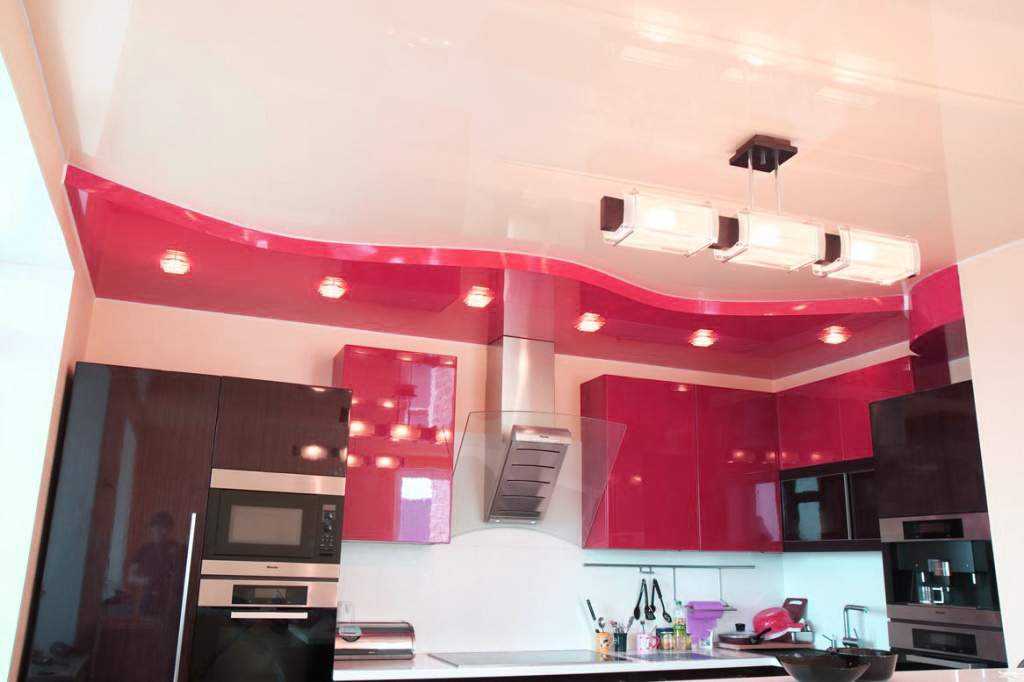 - На кухнях больших размеров затруднительно сделать потолочное покрытие единым массивом. Пленка ПВХ имеет максимальную ширину 5 метров, а стыковочные швы на хорошо освещенной поверхности потолка будут хорошо видны. Чтобы этого избежать, лучше делать двухуровневую конструкцию или использовать разные цвета пленки.