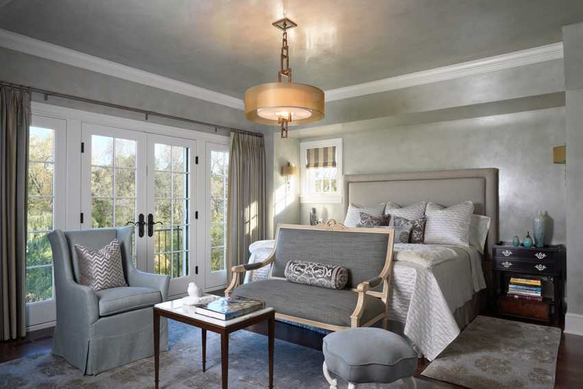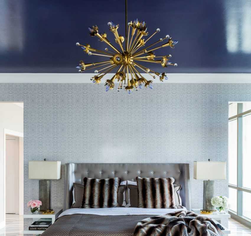 В спальне с высоким потолком использование изделий на цепях или подвесах функционально обосновано: свет становится более направленным, если находится ближе к нижней части комнаты. А вот плоские потолочные люстры без излишеств уместней в помещениях с низким потолком.