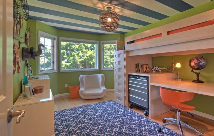 Такое решение превратит стандартный потолок в удачный фон, на котором все краски выглядят изумительно, а линии и детали – четко и графично.