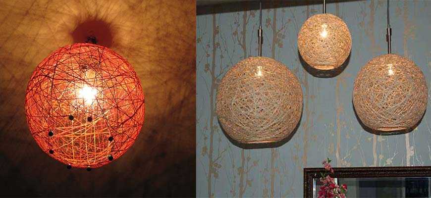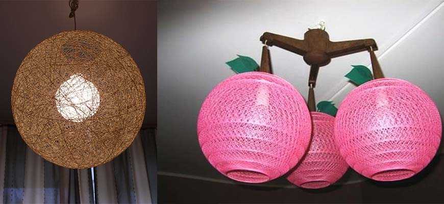 Очень популярны среди домашних мастеров люстры, которые создают из определенного материала (нити, клей, специальная паста, веревки и т. д.) и воздушного шара.