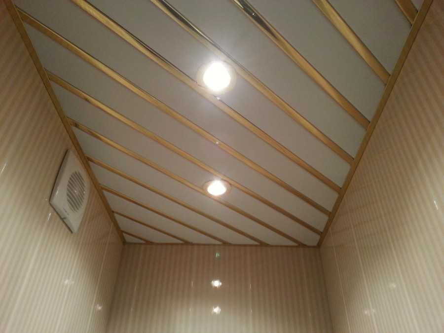 Очень часто во время монтажа реечного потолка в ванной используется укладка декоративных элементов «ёлочкой» – смотрится оригинально и красиво. А если при этом использовать разные по цвету материалы, то эффект превзойдёт любые ожидания.