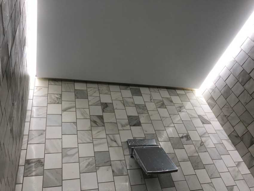 Если встает вопрос, какой потолок сделать в туалетной комнате для расширения пространства, то можно использовать стеклянные плиты. Они имеют матовую или глянцевую поверхности, разную степень прозрачности.