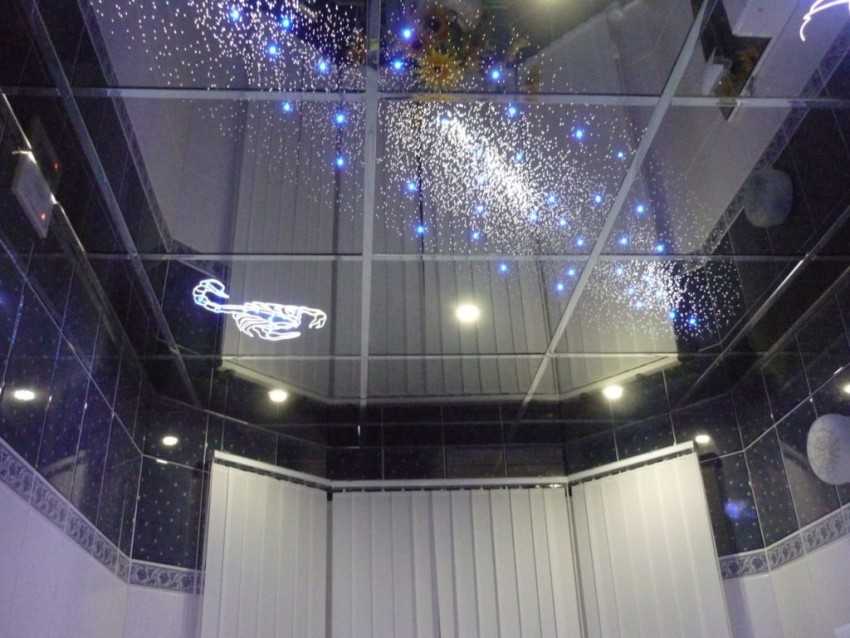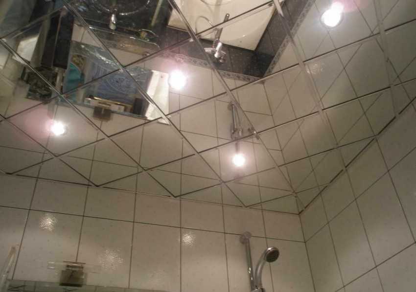Использование зеркал в отделке потолка позволяет комбинировать несколько отделочных материалов, создавая самые неожиданные композиции. Отличным дополнением к потолку станет стеклянная стена. Бюджетный вариант для тех, кто желает иметь зеркальные потолки в своей в ванной комнате без лишних затрат – самоклеющаяся пленка. Правда, и зеркало она напоминают лишь отдаленно.