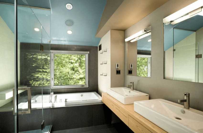 Современный подход к планировке ванной позволяет расположить ее в самых необычных местах. Это может быть 2-й этаж строения, веранда закрытого типа и даже мансарда. В последнем случае оформление усложняется формой кровли, которая является одновременно потолком и стенами мансардного строения. Оформить потолок будет сложнее из-за угла наклона, наличия балок, стропильных ног, окон.