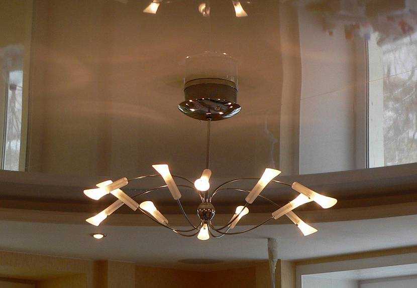 Если вы остановили свой выбор на глянцевом полотне, то будьте осторожны с люстрами, плафоны которой устремлены вверх. Покрытие отражает каждую лампочку, создавая очень интенсивное освещение, которое может быть утомительными для глаз. Кроме того, следует побеспокоиться, чтобы осветительное устройство хорошо выглядело сверху и не торчали провода, так как это будет видно в отражении (особенно в темной ПВХ-пленке).