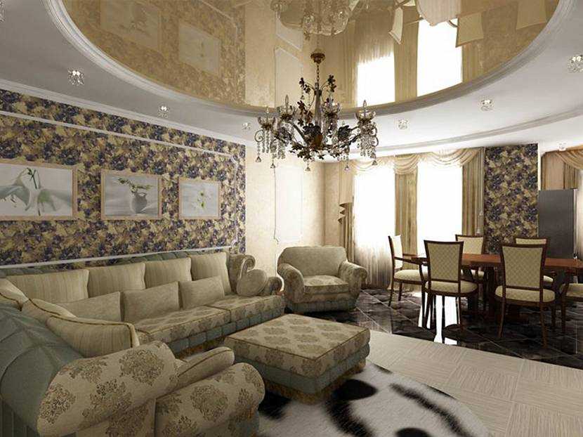 Подобрать люстру на натяжной потолок в зале не сложно — на фото в нашей статье вы уже видите примеры самых удачных дизайнерских решений.