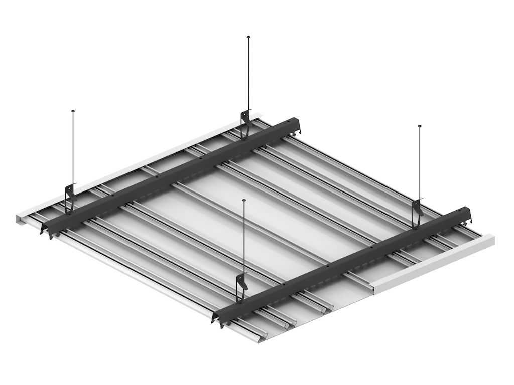 Реечный потолок представляет собой подвесную конструкцию, собранную из разных элементов, а именно: реек, траверсов, подвесов и несущих шин. Подвесы позволяют контролировать расстояние между несущей потолочной конструкцией и декоративным потолком, а траверсы прикрепляются главные реечные элементы.