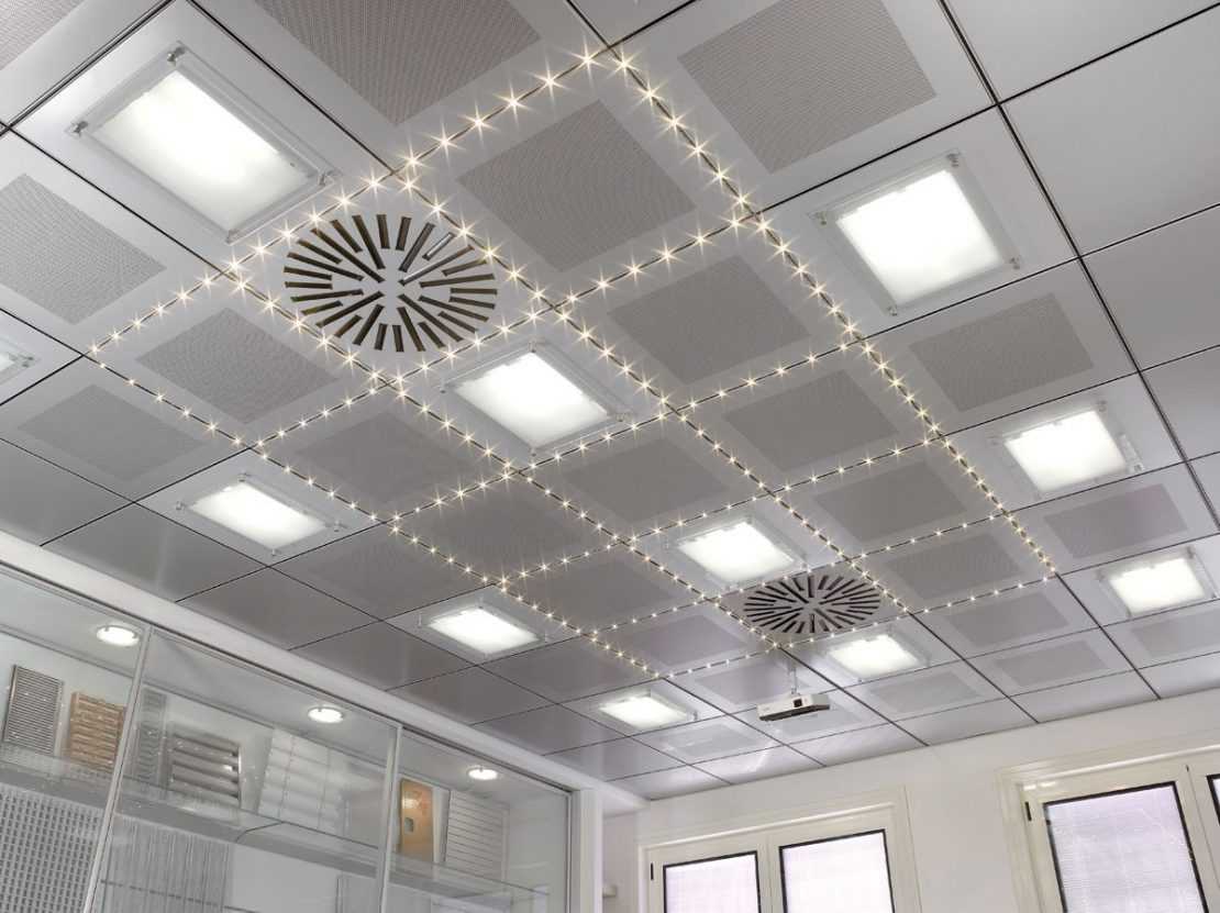 Из квадратных или прямоугольных плит с четкой геометрией собирают металлические кассетные потолки. Для украшения потолка используют перфорированные вставки, а также элементы из стекла или пластика. В несущем каркасе есть отверстия для крепежных приспособлений и установки осветительных приборов.