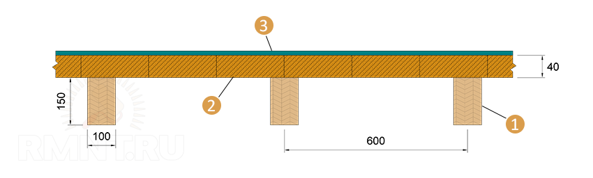 В качестве примера возьмём комнату длиной 5 и шириной 3 м. Через каждые 600 мм длины положим балки (9 шт.) из сосны сечением 150х100 мм. Перекроем балки доской толщиной 40 мм и настелим линолеум толщиной 5 мм. Со стороны первого этажа зашьём балки фанерой толщиной 10 мм, а внутри перекрытия уложим слой минеральной ваты толщиной 120 мм. Перегородки отсутствуют.