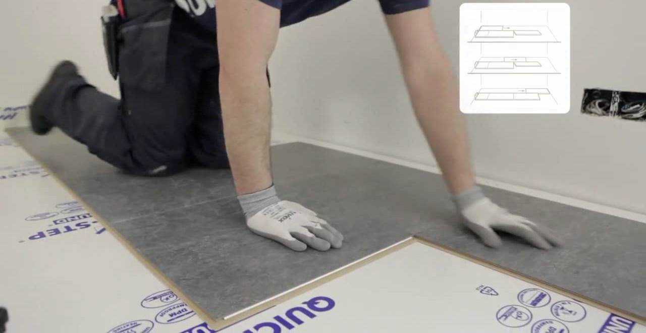 Производится укладка ламелей quick step по обычной технологии и включает в себя несколько стандартных этапов: