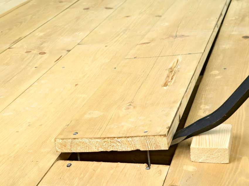 Если пол крепят при помощи шурупов, то их выкручивают, доски снимают последовательно. Если доски крепятся гвоздями, работы проводят так: