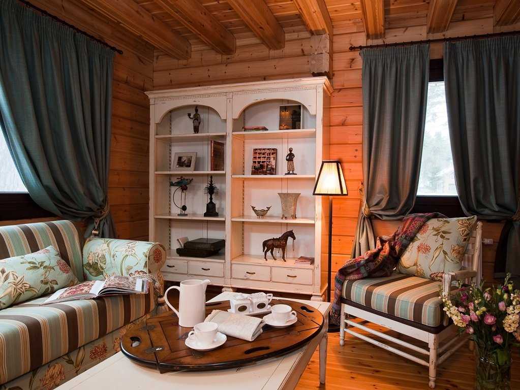 - для отделки используют только натуральные материалы. Пол выполняют из дерева или камня, стены штукатурят, красят или облицовывают камнем около камина, потолок оставляют окрашенным или оштукатуренным, часто его украшают деревянными балками;