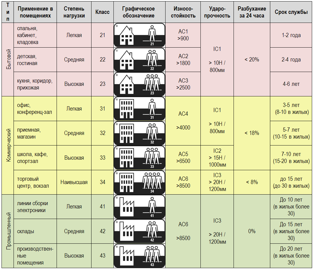Таблица характеристик ламината по классам