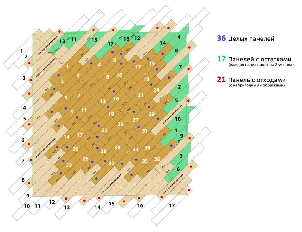 - Монтаж по диагонали требует множества подрезок, лучше взять на 20% материала больше.