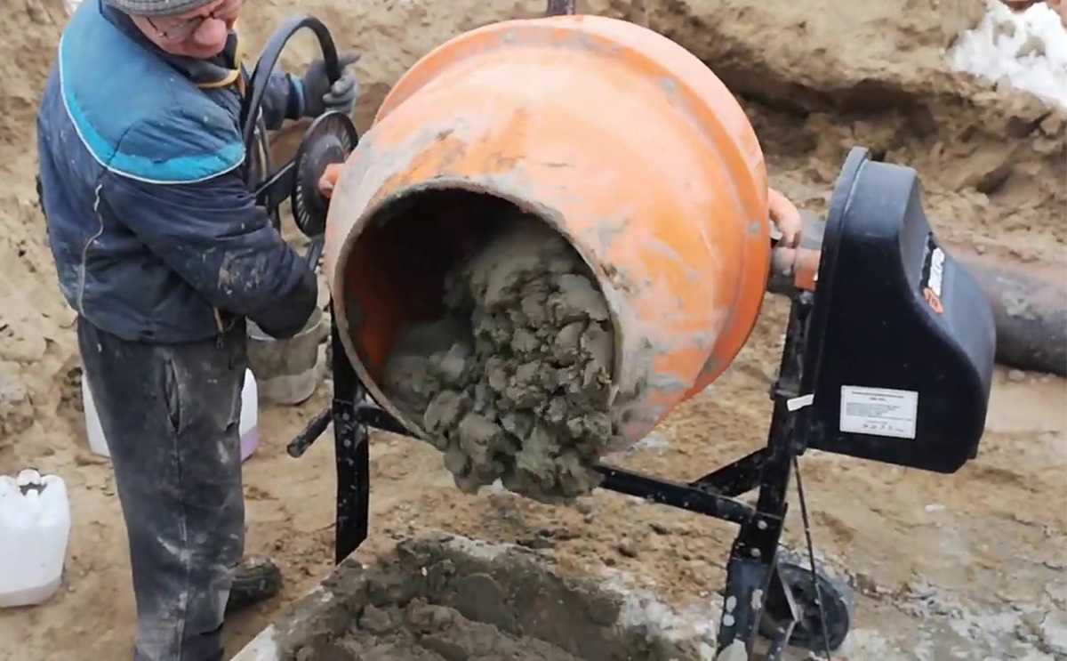 4. Бетон может быть заказан с РБУ или приготовлен своими руками из расчета: цемент, песок, щебень – 1:3:3, тщательно перемешивается и разводится постепенным добавлением воды до состояния сметаны. Нужно учесть, что он замешивается в нескольких емкостях, так как правильное бетонирование основания ведется непрерывно. Толщина слоя должна составить 40 см. Если пол разделен на сектора с помощью опалубки, то заливку проводят по ним. После схватывания бетона доски опалубки удаляют, и полости заполняют раствором.