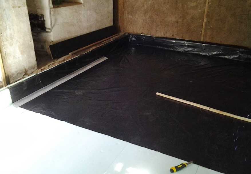 - На черновое покрытие стелится пароизоляционный слой из полиэтиленовой пленки. Стыки полос дополнительно закрепляются скотчем. Края заворачивают на стены (примерно 20 см).