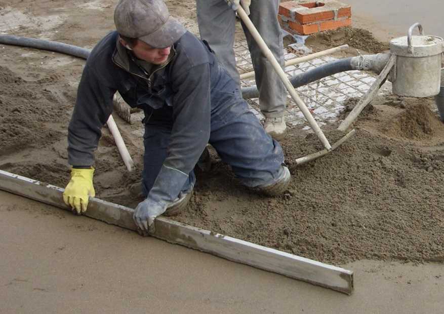 4. Теперь, можно приступать к самому процессу заливки пола раствором. Укладка бетона производиться поверх подготовленной поверхности с того конца помещения, который противоположен двери, при этом постепенно двигаясь к началу помещения. В этом процессе вам поможет использование ограничительных реек, которые выставляются в соответствии с уровнем пола. Тут очень важным является укрепление конечного слоя при помощи металлического каркаса. Чтобы осуществить армирование, может быть использована обычная сетка-рабица. При помощи указанных действий, можно добиться повышения ударной устойчивости верхнего слоя.