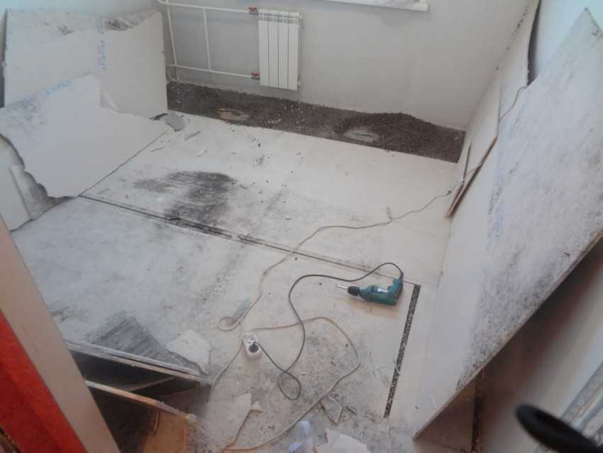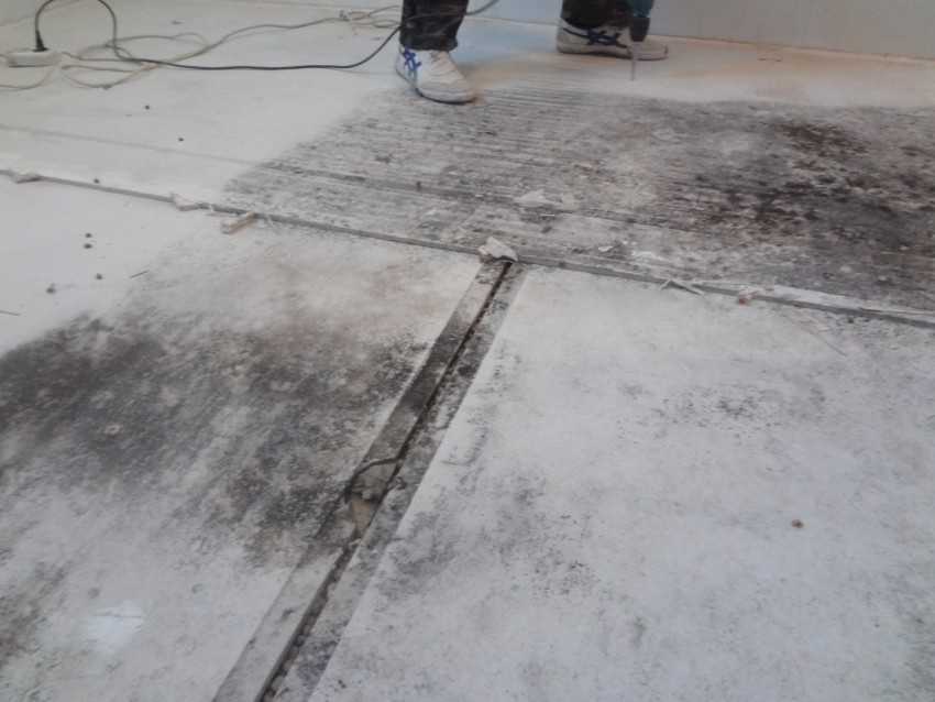 - Перед началом укладки стяжки необходимо тщательно подготовить поверхность. Старая стяжка демонтируется полностью, после чего проводится полная очистка основания от ее остатков.