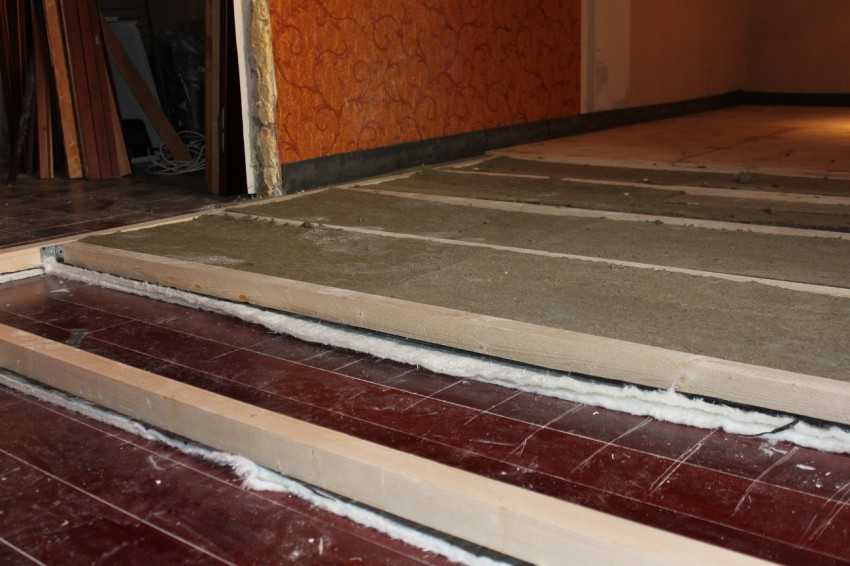 Если лаги под половыми досками лежат непосредственно на плите перекрытия, то оборудовать можно только плавающий пол. Он не будет соприкасаться с деревянным настилом. Толщина плавающей стяжки не может быть больше 5 см. Избыточная нагрузка на перекрытие приведет к его разрушению.