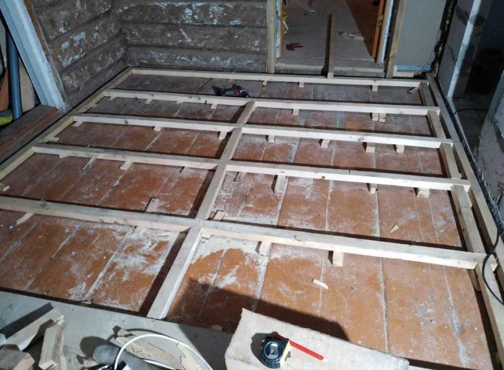 - На противоположных сторонах комнаты устанавливают два лага, которые выравнивают по горизонтали. Они будут ориентиром для остальных лагов.