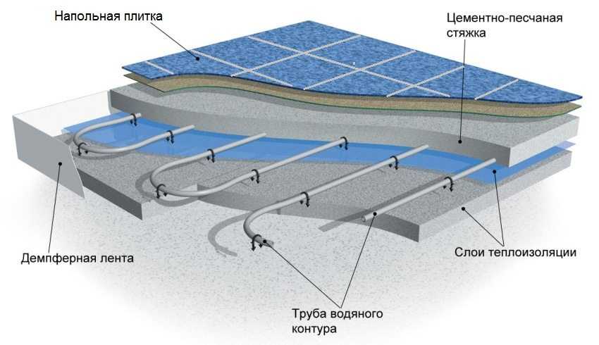 Существует два способа сооружения водяного теплого пола: в стяжку и настилом. Первый способ самый распространенный. Он предполагает заливку бетонной стяжки поверх труб контура. При этом способе обеспечивается хороший прогрев всех слоев пола. Второй способ менее трудоемкий, так как трубы кладут на стяжку или плиты, после чего сверху закрывают черновым и чистовым полом. Этот способ снижает эффективность расходования тепла.