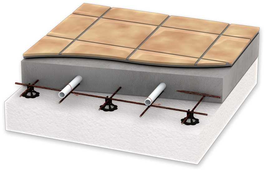 - Если прорыва не произошло, то можно делать стяжку. Для этого применяют бетон М300. Толщина стяжки над трубами должна быть больше 3 см.