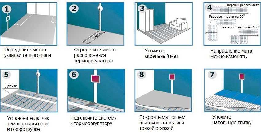 Шаг 5. Определяется назначение помещения. В ванной комнате и в помещениях с высокой влажностью следует отказаться от использования инфракрасных полов, так как велик риск повреждения обогревательной пленки. А вот кабельный и пол из матов подходят отлично. Матовый пригодится и в том случае, если планируется укладка плитки, а стяжка уже залита.