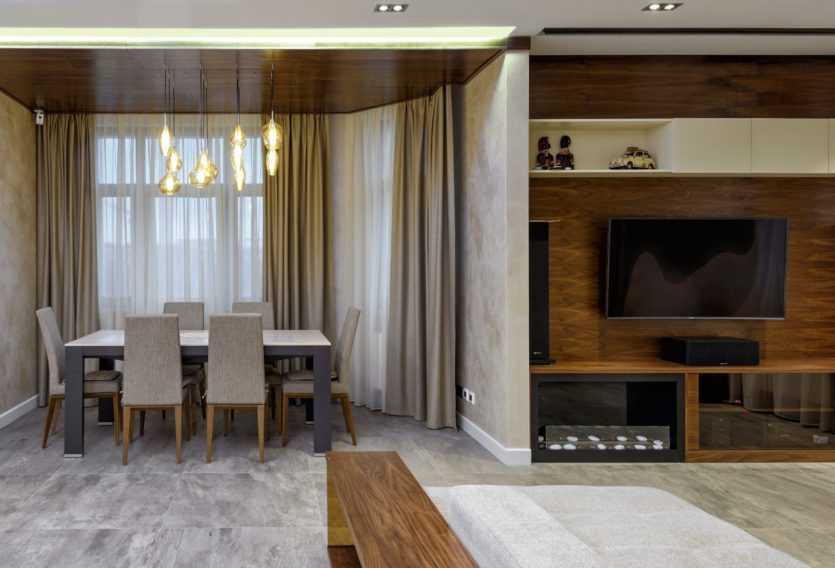 - дерево чувствительно к излишней влажности, к перепадам влажности и температур, к вредителям. Если гостиная включает в себя еще и столовую зону с обеденным столом, то дерево лучше скомбинировать с другим материалом;