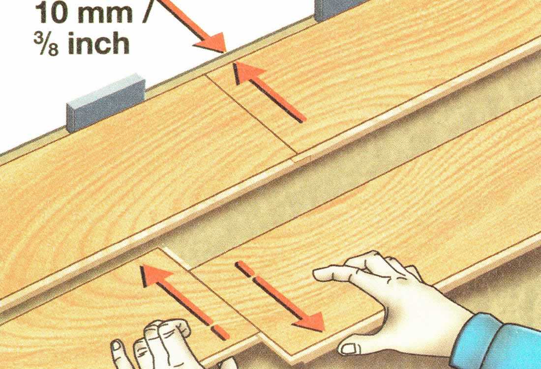 - С учетом температурного расширения ламелей, необходимо оставлять компенсационный зазор, порядка 1 см, между каждой стеной и ламинатом.