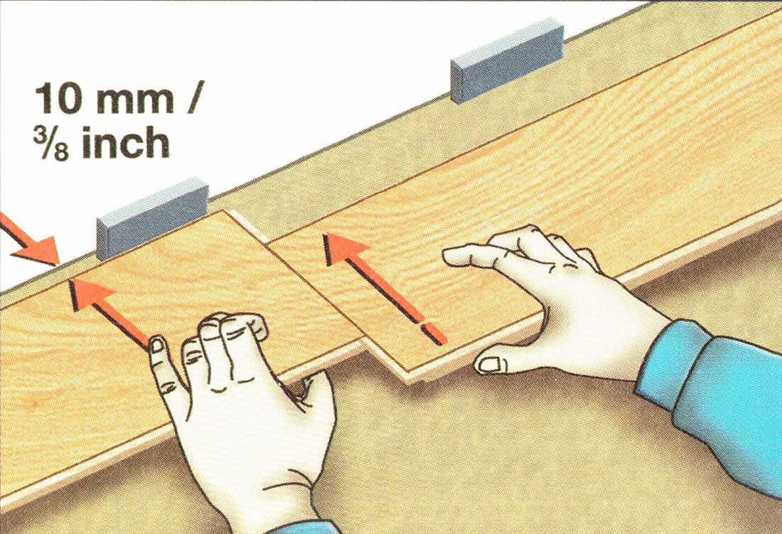 - Дощечка ламината выравнивается по ширине и ударом ладони забивается сверху.