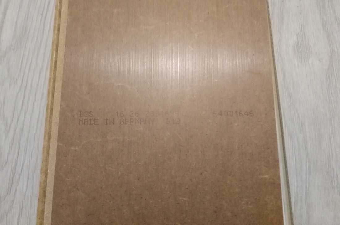 Перевернув ламель на обратной стороне находим заветную надпись «Made in Germany». Напечатана она на HDF плите, залитой прозрачным глянцевым составом, похожим на лак. Изготовитель утверждает, что этот слой состоит из специальной крафт-бумаги, служащей как стабилизирующий слой.