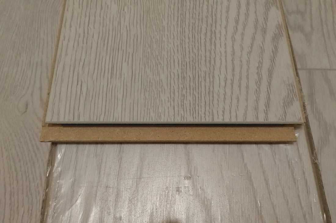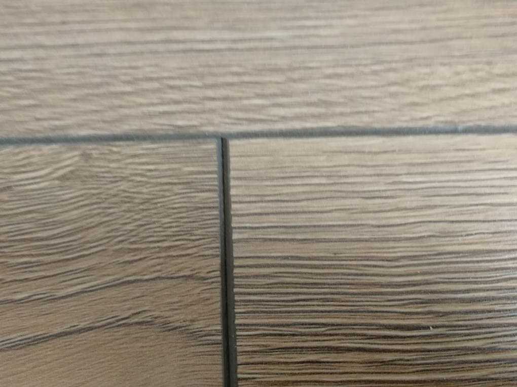 - Периодически на углах фаски наличествуют сколы, заметные на светлых цветах ламината, например, Дуб Бассано, представленный на фотографиях.