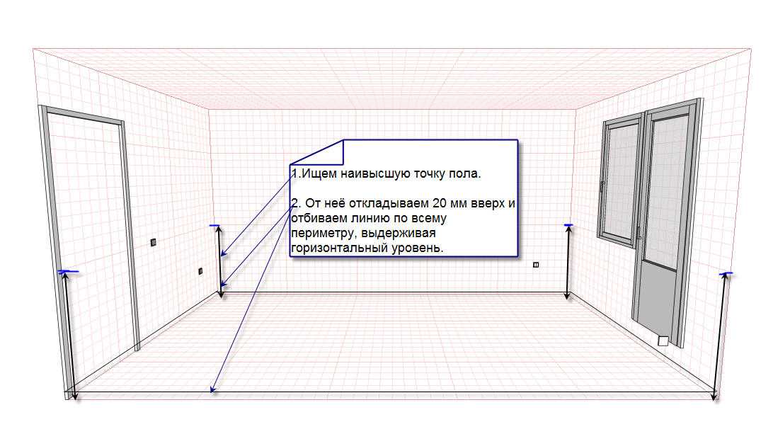 Минимальное измеренное расстояние, будет являться самой высокой точкой на поверхности и наоборот. От самой высокой точки, отступают вверх 3-5 см и прочерчивают горизонтальную линию.