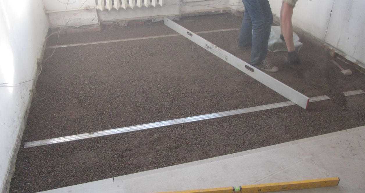 Сверху в него вдавливаются с подгонкой по уровню маяки из расчёта общей толщины засыпки не более 10 см. Если замена полов производится только в одном помещении дома, уровень будущего полового покрытия должен «прийти» к соответствующему уровню в остальных комнатах.