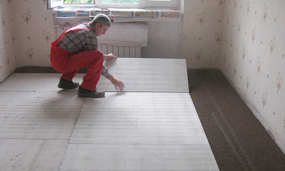 На завершающем этапе осуществляется укладка фанеры, ДСП, листов ГВЛ или другого покрытия. От качества выполнения этой процедуры напрямую зависит, будет ли насыпной пол ровным и аккуратным. Большие помещения следует разбивать на отдельные блоки. Так удастся свести к минимуму риск деформации поверхности или изменения высоты укладки плит.