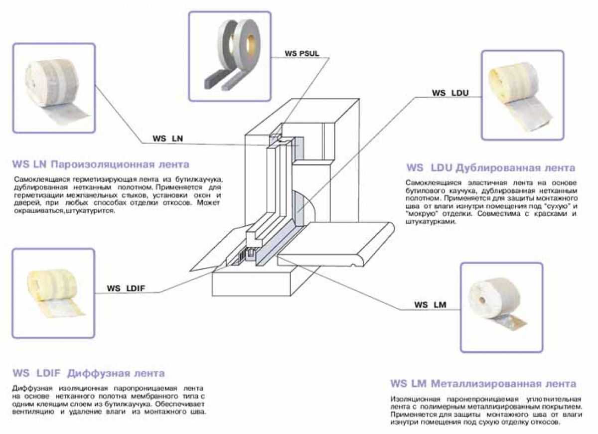 - ВС – пароизоляционные ленты для заделки стыков под сухую отделку откосов – из пластика или гипсокартона. проклейка лентами ВС снижает риск выпадения конденсата.