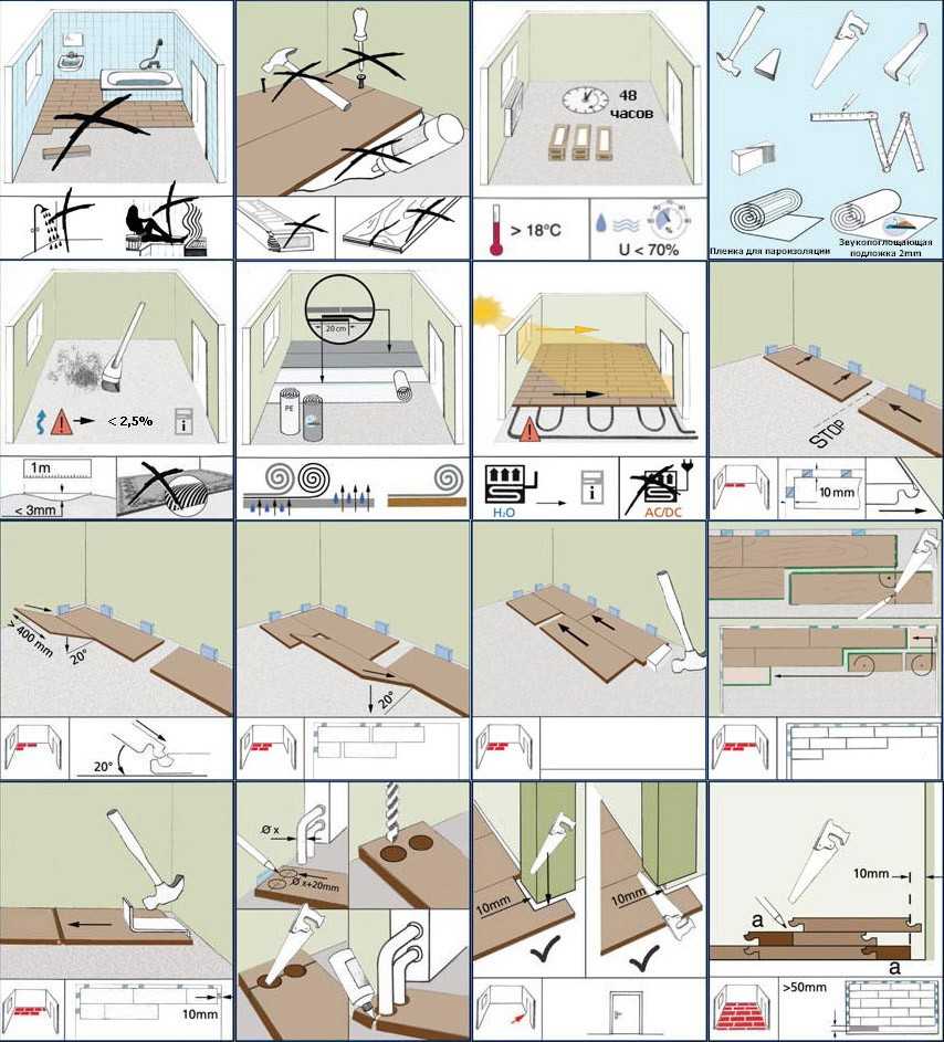 Некоторые полы, например паркетная доска, нуждаются в клеевом соединении в дополнение к замковому. Его нужно проводить по инструкции.