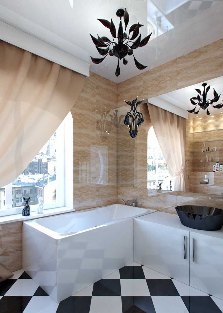 Крупную плитку можно комбинировать кафелем среднего или маленького размера. Можно организовать одну полосу в углу из крупной плитки, но немного темного цвета. Даже одна вертикальная полоса позволит визуально сделать потолок выше.